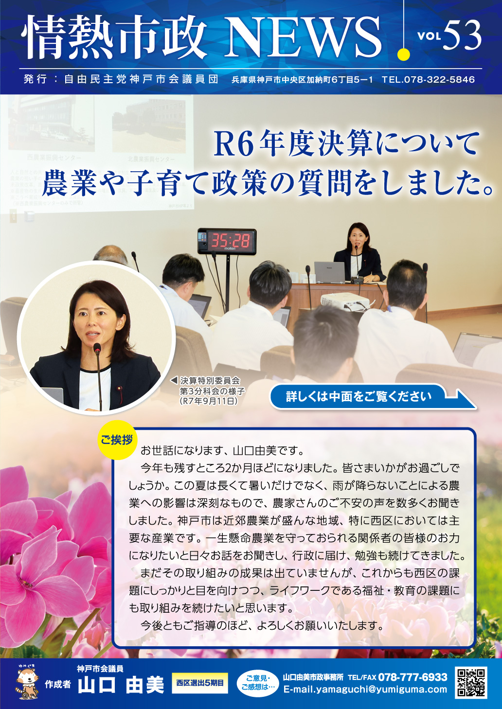 Topics1では、決算特別委員会にて提案した農業や子育て政策について取り上げています。